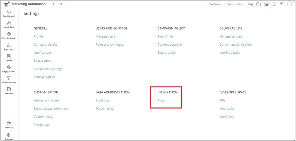 - In Zoho Marketing Automation, navigate to Integrations > Zoho Apps > CRM.